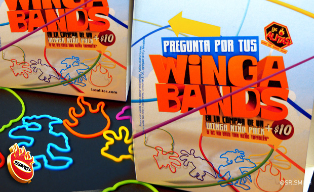 La nueva promo de Wingalesio® ya está en Las Alitas, se trata de las nuevas ‘WingaBands’ , las cuales vienen en 6 distintas formas y colores, con siluetas relacionadas a elementos de esta cadena de restaurantes. Así, la flama del logo de Las Alitas, una “hamburGruesa”, una pisada de pollo, la cresta de Wingalesio y dos siluetas de esta simpática mascota de la marca, adornarán las muñecas de chicos y grandes en este 2011.